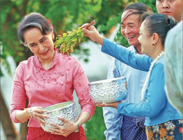 ▲ 4月16日下午,国务资政昂山素季、总统温敏和第一夫人杜秋秋共同参加内比都的泼水节节庆仪式。参加活动的还有副总统亨利夫妇、议长吴迪昆妙夫妇和各部长夫妇等。泼水节活动共持续5天。