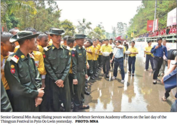 4月16日,总司令敏昂莱夫妇考察彬乌伦军事基地,并在缅历新年之际考察参与当地的泼水活动▼