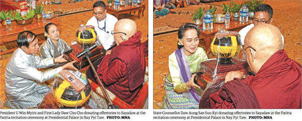 4月17日,缅甸为庆祝缅历1380年新年,在内比都举行了诵经大会仪式,总统温敏夫妇、国务资政昂山素季出席,大长老Kavisara参会并开启诵经仪式▼