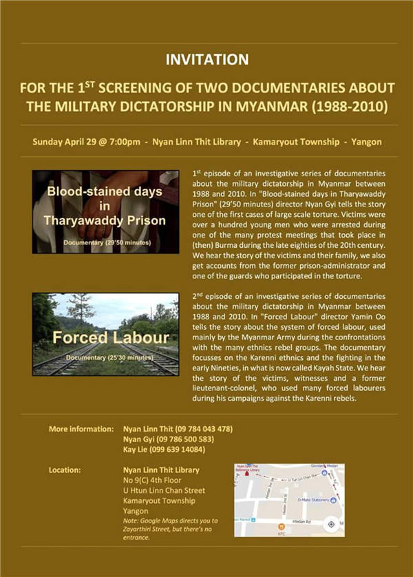 缅甸政治犯和狱警之间如何和解?转型正义如何实现?这个主题在缅甸社会还没有得到充分的讨论。荷兰政府资助DVB(缅甸民主之声)和几位导演用纪录片的形式把这一些争论的现实基础记录了下来。一个故事讲的是90年代初国防军用暴力方式强征苦力以驱赶克伦民族联盟至泰国边境。另一个是讲述民主运动的政治犯在达亚瓦底遭到狱警虐待的故事。施虐人认为自己不过是在履行职责,而有的受虐囚犯只希望通过讲述自己的故事以纾解胸中多年的积怨。