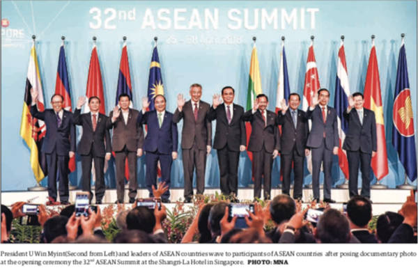 第三是外交方面。4月26-28日,缅甸总统吴温敏离开内比都,前往新加坡参加第32届东盟峰会,这是新总统上台后的首秀,总统在总统府参加第32届东盟领导人全体会议,会议主题是“建设活力与创新的东盟”。这一首秀,总统就与多国首脑会面。