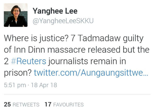 4月18日,联合国缅甸人权事务特使李亮喜在其推特上转发了一条消息,谴责在因顶村惨案中被捕的7名军人在近期特赦中被释放一事,并认为“与此同时两名路透社记者仍然被关押在监狱中一事缺乏正义”▼,但其实此前这条消息就已经被证实是假消息。这条假消息最早是于4月18日登发于缅甸国家电视台(MNTV),该电视台隶属Sky Net公司,后者为缅甸大亨吴觉温的瑞丹伦公司所有。随后,总统府发言人吴佐忒出来辟谣,并要求有关新闻社进行道歉。