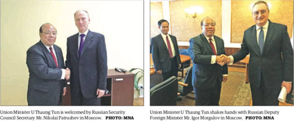 4月24-26日,联邦政府办公室主任吴丹吞领衔缅甸代表团前往俄罗斯索契参加第9届国际高官安全事务会议。参加完本次会议后,吴丹吞前往莫斯科进行了访问,并在莫斯科与俄罗斯联邦安全委员会秘书帕特鲁舍夫(Nikolai Patrushev)会面。会后,双方就强化有关若开事宜、国家安全事宜的各方面合作进行了讨论。