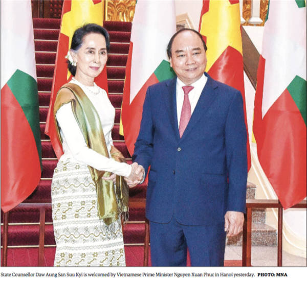 4月19-20日,应越南国家总理阮春福邀请,国务资政昂山素季离开内比都前往越南进行访问,与越南总理阮春福、越共中央总书记阮富仲、越南国会主席阮氏金银会面。昂山素季在19日上午抵达河内后,接受了阮春福的欢迎仪式,检阅了仪仗队,随后进行了正式会谈。会上,双方就自昂山将军和胡志明主席时期缅越友谊进行了回顾,就双边近年来密切联系、积极合作,尤其是2017年8月建立“全方位双边合作关系”以来,双边不断增强在农业、交通、能源、通信、旅游和教育方面的合作。会后,国务资政参加了缅甸和越南有关邮政、通信与信息科技合作等MoU的签署仪式。