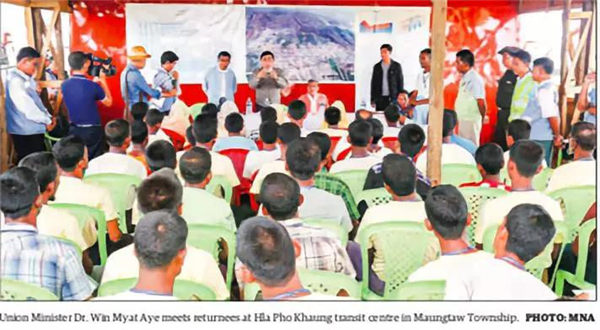 难民中转站考察。部长对难民表示,政府将依法、系统性进行遣返安置,原有家者将很快送回家中,房屋被烧毁者将在原地或第三地进行房屋补偿,相关房屋将根据以工代赈(Cash-for-work)方式进行建设。部长表示,返回者必须忠于缅甸,遵守缅甸国家法律,在相关地区有序交通,将有利于构建族群间信任。自愿申请公民资格卡者将首批获得公民资格卡(NVC),随后将在教育、卫生和就业方面得到援助。