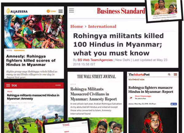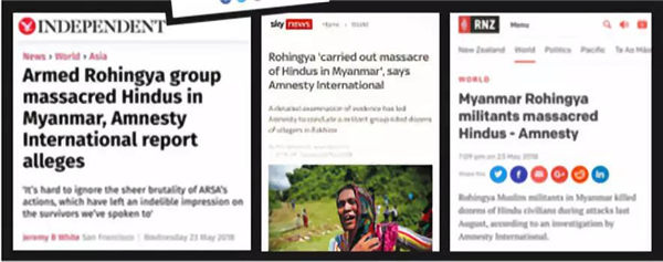 此时,剧情峰回路转——原先最喜欢和缅甸政府作对的“大赦国际”,却通过一篇报告暂时让缅政府松了口气。5月22日,大赦国际组织发布报告显示,有新的证据说明ARSA恐怖分子在若开邦有屠杀的证据,这件事随即被各大国际媒体转报▼。如VoA就报道了标题为《大赦国际认为,新证据揭露ARSA恐怖分子在若开屠杀印度平民》的文章,写出ARSA屠杀99名印度妇女、男性、小孩等行为(2017年8月)。BBC则播放了对大赦国际成员Laura Haigh的采访,其对大赦国际在若开的调查进行了陈述,包括有关平民在Kha Maung Seik村被杀害的情况。他表示,ARSA恐怖组织对杀戮有责任。相关报告还见诸于半岛电视台、CNN、AFP、CAN、FOX、Sky新闻、海峡时报、卫报、每日电讯、Daily Star、Independent、华尔街、华盛顿邮报、印度时报、时代周刊和曼谷邮报等。