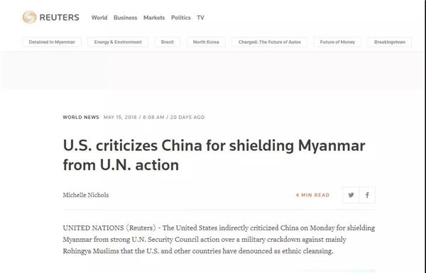 ▲支持缅甸诉求的中国,却被美国扣上了一顶大帽子。5月15日,路透社发布名为《美国谴责中国庇护缅甸免遭联合国行动》的文章,该文章表示,美国驻联合国代表Nikki Haley表示,在5月15日举行的联合国安理会会议上,由于“一些安理会成员国想要阻止我们行动,基于一些愤世嫉俗以及自私自利的行为”;“有些人用毫无意义的说辞损害了安理会的团结,只会弱化安理会所传达的信息”。此前,中国驻安理会大使马朝旭对安理会表示,缅孟双方应当双边解决有关问题,以确保“不让问题变得更加复杂”。