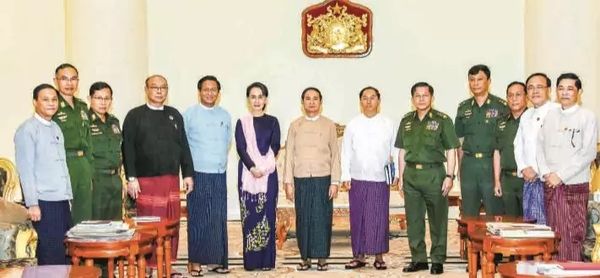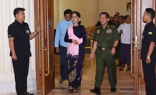在政府“单方面”公布了与联合国的MoU,各方面载歌载舞之时,军方则脸色铁青。对于此事带来的阴郁气氛,素妈当然也有所顾忌。为此,6月8日,国务资政昂山素季与总司令敏昂莱罕见在内比都召开了关于若开问题的军政协调会议——国防与安全委员会会议。(国安委在外交决策中的重要性请参照上期外文译‖ 缅三朝重臣、纪委书记之女讲述历届政府决策方式)出席会议的人包括总统、国务资政、总司令、两院议长、副总司令、内政部长、国防部长与边境事务部长。这是吴温敏总统刚上台来的第一次此类会议,以及民盟执政以来第二次召开此类会议。