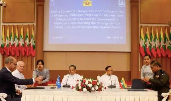 6月6日,缅甸国务资政部正式发布新闻,缅甸政府与联合国机构在5月31日签署了有关援助若开地区流离失所者返回的谅解备忘录(MoU)。主要内容包括:劳工移民人口部(MoLIP)与联合国机构在内比都民族和解与和平中心正式签署相关协议,联合国将支持缅孟两国在2017年11月23日签署的“关于遣返若开流离失所者返回的协议”。该协议旨在促进难民自愿、安全和有尊严地返回,并确认联合国机构将介入其中。该MoU于2018年5月31日正式生效。其中: