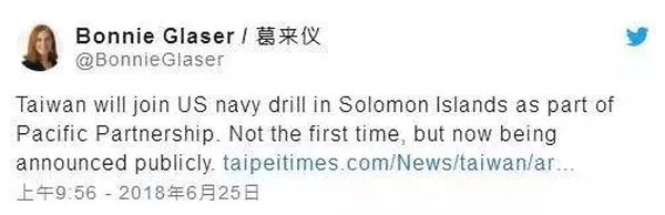 3.直播港澳台:据台湾媒体报道,美国华盛顿战略暨国际研究中心主任葛来仪日前在推特上透露,台湾将加入美国在所罗门群岛举行的海军演习。对此,你又做何解读?