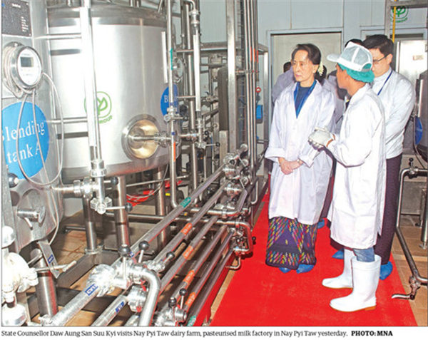虽然各界在热炒新总统吴温敏上台后,会怎么样发挥更大的作用,但实际上是,我们在各类新闻中还是更多看到昂山素季的身影,事无巨细、鞠躬尽瘁,比如这张图——7月31日,国务资政昂山素季赴内比都考察牛奶农场、巴氏奶加工厂和Pe Taw畜牧场 ▼