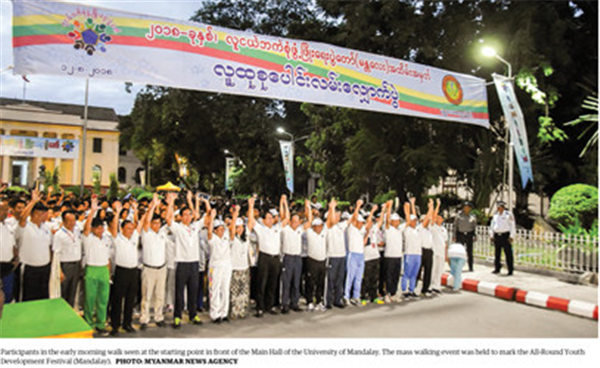 8月12日,为庆祝曼德勒“青年全面发展节”,逾4000人参与了以曼德勒主大厅为起点的竞走活动。该活动自当天上午5点开始,标语是“致力于发展青年的五项能力:体魄、智力、道德、社交和经济——以学术和技术知识、青年道德,充分调动才智,构建未来人类社会。”参与本次竞走活动的官员包括宣传部部长培敏、教育部部长妙登基、卫生部部长敏推、曼德勒省省长佐敏貌以及其他地方官员、校长、老师、不同地区来的学生、公务员和当地民众等。竞走活动结束后,在上午7点左右,部长们欣赏了当地青年表演者的表演。