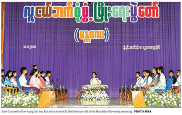 这场浩浩汤汤的“青年全面发展纪念日活动”从8月11日到8月13日,活动地点选在曼德勒。8月11日上午,昂山素季赴曼德勒大学参加青年文学对话,同时出席的还有边境事务部部长耶昂、宣传部部长培敏、宗教文化部部长吴昂哥、卫生部部长敏推、曼德勒省行政长官佐敏貌等官员。