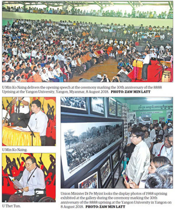 其中还包括“30年民主运动之旅”和“少数民族与联邦国家的平等权利”等分论坛。参与研讨活动的还包括议员、前学生运动代表等人。民盟中执委秘书处成员吴年温出席活动并表示“为民主之战斗并没有平息,我们都有希望和动力,即便是活动已经过了三十年。”出席活动的还有宣传部部长培敏、仰光省省长吴漂敏登、仰光省议会议长吴廷貌吞和副议长吴林奈敏等。纪念仪式上高举“战斗孔雀”旗帜,这1988年曾经用过,随后各方默哀8秒,哀悼那些在此前全国民主运动中的牺牲者。委员会代表吴特吞宣读了本次活动的宣言。最后吴哥哥基致总结辞。