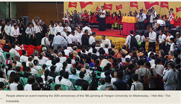 8月上旬令人注目的一件大事,实际上是缅甸88年反军人独裁运动30周年。正因为这场运动,成就了今天的民盟和昂山素季——然而,昂山素季在百忙之中发表了上文所说的那么多讲话,却没有对这场运动的纪念发表任何见解。关于此后文还会提到,此处先说说昂山素季关注的是什么——是与这场运动的核心主体——青年人有关的活动。
