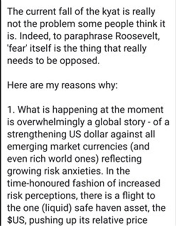 对于缅币贬值,长期关注缅甸经济的澳大利亚经济学家肖恩·特纳(Sean Turnell)发表了其看法: