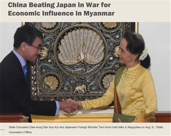 此前,肖恩·特纳称,斥资75亿美元的“皎漂港”项目是疯狂(crazy)与荒谬(absurd)的,而后皎漂项目被塑造为“债务陷阱”。8月初,又传出缅计财部副部长吴瑟昂称“皎漂经济特区项目规模已经被大规模”削减(只保留13亿美金)的消息。当河野访问缅甸时,众多媒体似乎找到了“大腿”和“救星”,一边渲染日本投资的认真负责、谨慎小心和注重社会效应,如有学者称:“中国的缅甸政策非常独断(assertive),近乎于侵略性,而日本,更加谨慎”;另一边则渲染称“不如把皎漂交给日本人”来做的消息,例如有媒体引用Smart Group of Campanies董事长U Kyaw KyawHlaing的话说“我们要学会如何在一个房间里与一头大象和平相处。当然,我们也需要找到平衡它的力量,如果我们没有能力的话。”