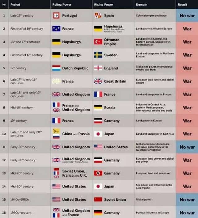 为了佐证自己的观点,美国人艾利森研究了西方史观下16个帝国霸权的更迭事件,最终研究表明:其中高达12组霸权更迭,都不可避免的走向了战争!