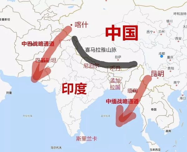 中巴战略通道与中缅战略通道的推进,就像两条胳臂的不断伸展。等到神州可以从新疆喀什和云南昆明直下印度洋的时候,我们的“手”就可以越过美日岛链和马六甲海峡的封锁,直接拥抱亚非拉的广阔天地了。那么,夹在“双臂”之间的三哥呢?有没有被两面夹击的感觉?