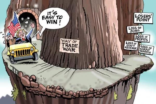▲【贸易战之路:死路一条】美国总统特朗普一边高喊“打赢很容易!”一边开车驶向“贸易战之路”,路的尽头是失败者之地:失业、亏损、政府税收损失和便宜商品减少。(美国卡格尔漫画网)