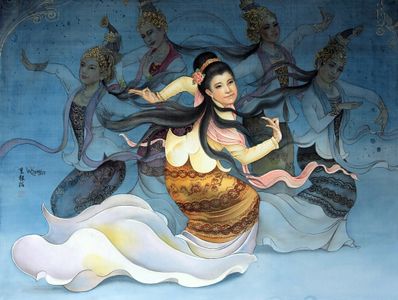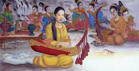 801年骠国乐队和舞蹈家曾到唐朝长安奏乐献艺,诗人白居易为此作了“骠国乐”名诗:~玉螺一吹椎髻耸!~铜鼓千击文身踊!~珠缨炫转星宿摇!~花鬘斗薮龙蛇动!(见下图缅甸王根绍Wang Kyaw Kyaw两幅名画)。