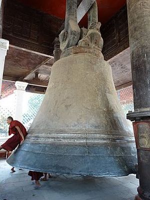 下图是明宫钟(Min Gun Bell)——貌似上述两大铜钟,排名世界第三大,重90,718公斤,外层是金,依旧巍然挂在实皆省明宫城(Sagaing Min Gun City),至今金光闪闪、钟声洪亮!