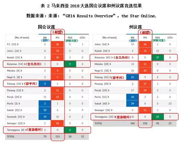 东铁创造的经济利益还具有重要的政治意义。虽然希盟成功执政,但是在诸多方面,希盟还面临着来自国阵和伊斯兰党的冲击,尤其是民意支持率方面。其中,在东铁必经的彭亨州、登嘉楼州和吉兰丹州,希盟在2018大选中可谓是惨败(请参阅下表2)。在国会议席的选战中,希盟输掉了全部吉兰丹州和登嘉楼州的议席;在14个彭亨州议席中,也只拿到了5个,其余9个由国阵赢得。在州议席的竞选中,同样,希盟在吉兰丹州和登嘉楼州一席未得;在42个彭亨州议席中,也仅仅取得9个。相比希盟在其他州的胜利而言,这样的失败说明希盟在这三州的民意支持度明显低于其对手。