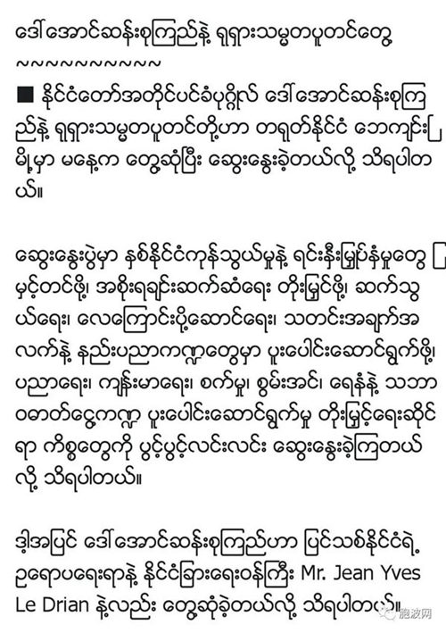 近日,缅甸社交网站FACEBOOK热传缅甸国务资政昂山素季与俄罗斯总统普京于4月27日在北京出席第2届“一带一路”国际合作高峰论坛期间会见与商讨的新闻。会谈中昂山素季向普京传达关于两国提升贸易与投资,提升两国政府间的交流与往来,在通讯、航空、信息技术合作方面的观点;并对教育、卫生、工业、能源、石油与天然气开发领域方面相互坦白地交换意见……