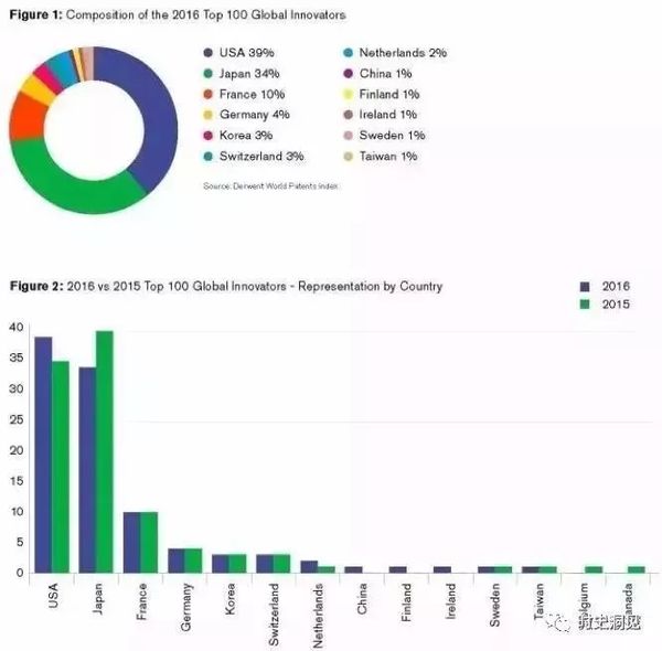 下图是Clarivate Analytics发布的2016年全球最具创新企业100强,美国和日本分别以39家与34家企业,遥遥领先。