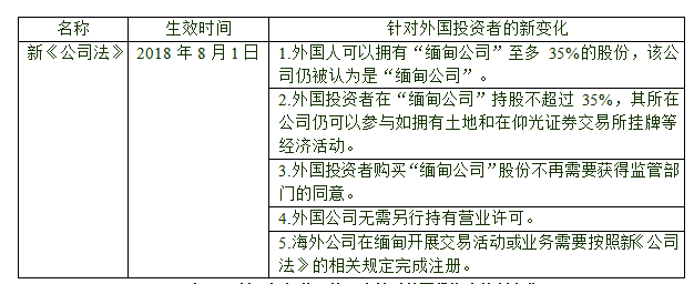 于2018年8月1日生效 的缅甸新《公司法》则通过规范公司管理的相关规定,并通过电子化公司注册流程来增加公司管理的灵活性和可靠性。新法在原1914年旧《公司法》的基础之上,保留了“缅甸公司”和“外国公司”的区别,但是放宽了对外国投资者在本土的“缅甸公司”持股的比例要求。