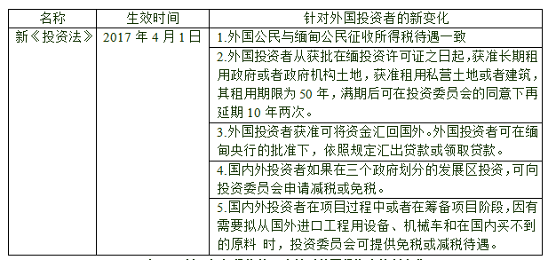 于2017年4月1日正式生效的新《缅甸投资法》,着力引导内外资积极投入绿色环保、高科技、专业化和国际化产业。