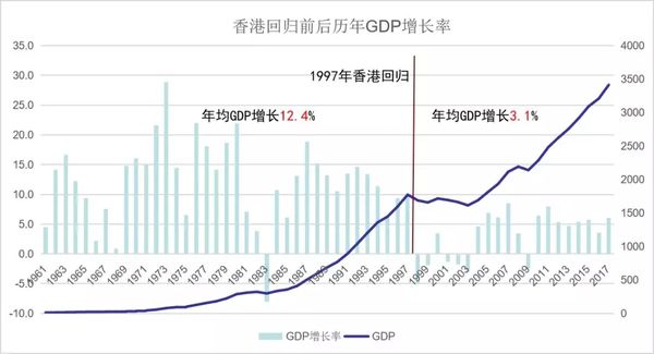 我们来看一个图:1997年香港回归之前,年均GDP增长率达到12.4%,回归后年均GDP仅有3.1%。