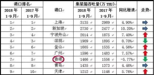2018年世界十大港口,中国占了7个,其中香港排名第七。