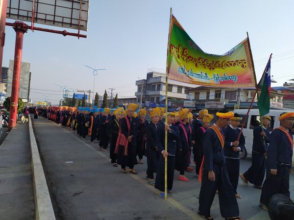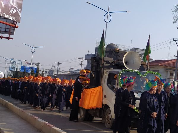 今年的直榜月盈日,恰好座落在3月8日这一天,与三八国际妇女节重叠在一起。掸南东枝地区的勃奥(Pa-Oh)民族,循例在这一天举行了一场盛大的游行活动,庆祝自己的民族节——多年前,勃奥民族就已定这直榜月盈日为自己的民族节了。