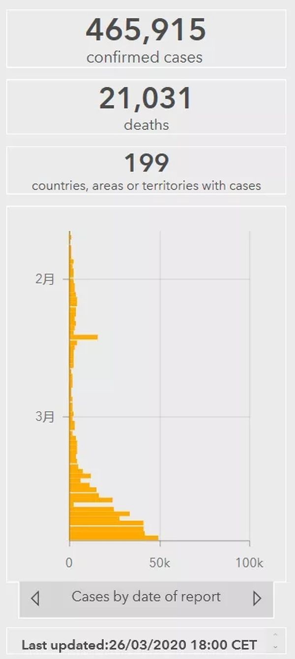 世卫组织实时统计数据显示,截至欧洲中部时间3月26日18时(北京时间3月27日1时),全球确诊新冠肺炎465915例,死亡21031例,目前全球已有199个国家地区出现新冠肺炎病例。