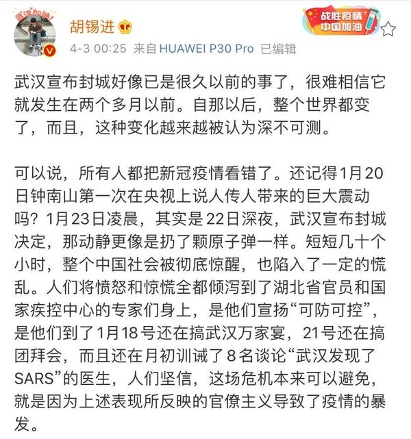所有那些批评和思考都有确凿的来龙去脉,也是应当继续坚持的。然而老胡必须指出一个天大的事实和它天大的影响,那就是我们谁都没有想到,这场新冠疫情在中国上演的仅仅是一个序幕,它的真正暴发,那种全球大流行病的超级暴发,那种比武汉猛烈不知道几倍的对经济社会体系彻底的冲击,随后在中国以外的地方,尤其是在欧洲和美国接连喷暴而出。