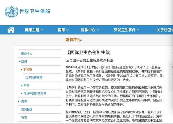 2007年生效的《国际卫生条例》要求,缔约国需及时、有效地向世界卫生组织通报在本国出现的可能构成国际关注的突发公共卫生事件。如不履行此义务,将会引发相关国家责任问题,从而带来受害国或受影响国对该国追究责任的严重后果。