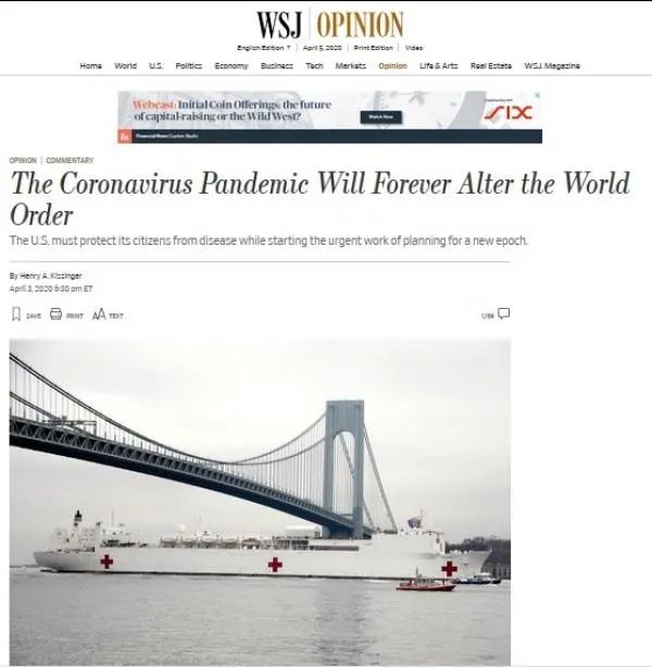 正如基辛格4月3日在《华尔街日报》刊文所说的,疫情后的世界将与现在不再相同。新冠疫情大流行对全球化的颠覆效应及对世界大国的异常沉重冲击,将很大可能促成国际关系格局的根本性转变。