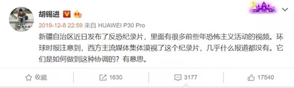 “新疆自治区近日发布了反恐纪录片,里面有很多前些年恐怖主义活动的视频。环球时报注意到,西方主流媒体集体漠视了这个纪录片,几乎什么报道都没有。它们是如何做到这种协调的?有意思。 ”