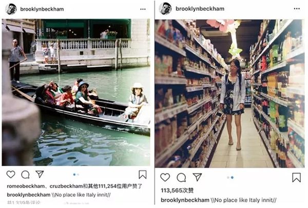 下图是贝克汉姆的儿子布鲁克林在自己的社交网站上上传了两张亚洲游客的图片,其中一张是一群亚裔游客坐在一条小船上,一张是一个亚洲游客在超市,他说这里不像是意大利了。