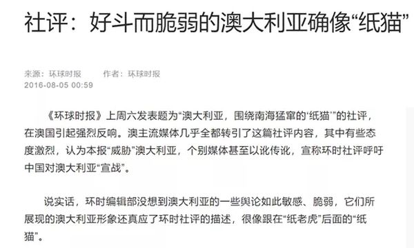 总的来说,中国媒体反击西方媒体,让我感觉最爽的一次是2016年8月环球时报发了一篇“澳大利亚,围绕南海猛窜的‘纸猫”,讽刺澳大利亚是“纸猫”,