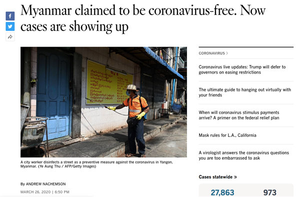 缅甸刚刚“破功”,《洛杉矶时报》评论员安德鲁·纳克森就冷嘲热讽地发表了一篇“缅甸声称没有新冠病毒,但现在有病例出现了”。