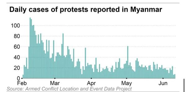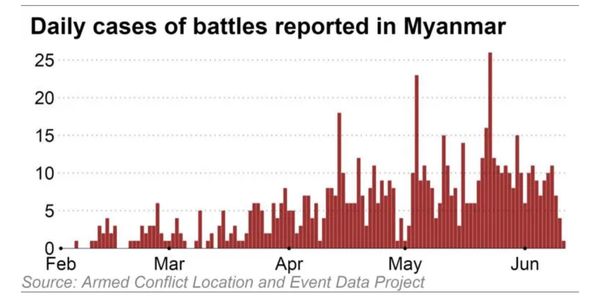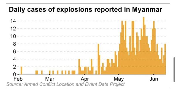 根据美国非营利组织"武装冲突地点和事件数据项目"(ACLED),缅甸5月份发生了297起爆炸事件,比4月份的73起大幅上升。据报告,大多数是"身份不明的"武装团体所为。