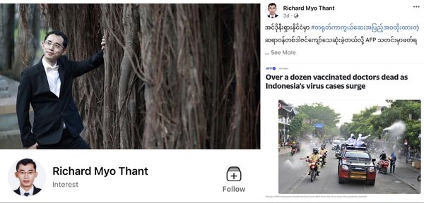 首先看一下这则消息是谁传来的,注明是“Richard Myo Thant”。此君是如何得知此讯息的?其在脸书上这样写的:“在印度尼西亚,有12名以上完成接种中国疫苗的医生已经死亡,这是由AFP新闻中获知的讯息。”