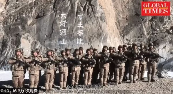 海拔4000多米的加勒万河谷,刻有“大好河山寸土不让”字样的岩壁下面,数十名中国边防战士庄严肃立。他们面向一面鲜艳的五星红旗宣誓,并向祖国人民送上新年祝福。