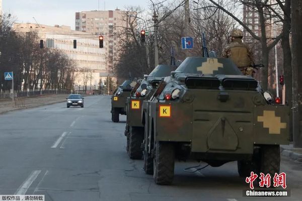 当地时间2月26日,乌克兰首都基辅,乌军人登上装甲运兵车。