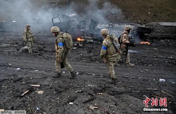 当地时间2月26日,乌军队称在首都基辅与俄突袭小组发生战斗。图为交火后,乌军人收集未爆炮弹。