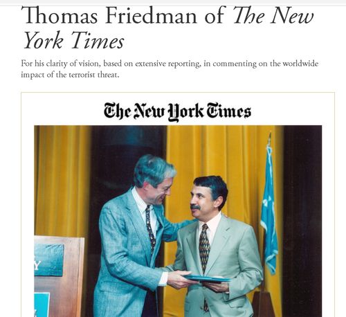 另外,虽然今年的“普利策”奖的获奖作品中,也有“批评”美国政府中东政策“失败”和“错误”这样的报道,会被一些人拿来当做“普利策奖也批美国”的依据。可这些报道其实是在大错已经铸成,美国全社会都在反思且把责任都已经推给“前任政府”的局面下撰写的,属于无关痛痒。而在美国正在犯下这些错误的2002年和2003年,那时“普利策”奖的获奖作品中,可是不乏认为美国是在给伊拉克等中东地区人民带去“民主和自由”的内容的。