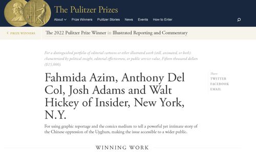 当地时间5月9日,被视为美国新闻界“最高奖项”的“普利策”奖,公布了2022年度的获奖名单。其中,美国“内幕”网站(前“商业内幕”网站)因为一篇关于中国新疆的“漫画报道”,而赢得了这家美国媒体自成立以来的首个相关奖项。
