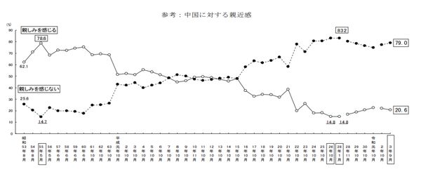 日本内阁府2022年1月公布的“外交舆论调查”数据显示,78.9%的日本受访者对中国大陆持负面态度,其中回答“不亲近中国大陆”的比例为43.5%,选择“相对不亲近中国大陆”的比例为35.4%;2021年公布的数据中,对中国持负面态度的比例为77.3%(“不亲近中国大陆”的比例为41%,“相对不亲近中国大陆”为36.4%);2019年,对中国大陆持负面态度的比例为74.9%,(“不亲近中国大陆”为35.9%,“相对不亲近中国大陆”为相对39%,2020年数据未公布)。
